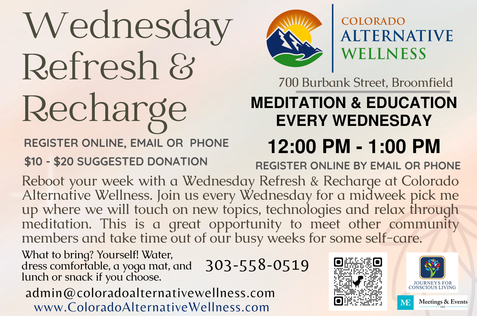 Reboot your week with a Wednesday Refresh & Recharge at Colorado Alternative Wellness. Join us every Wednesday for a midweek pick me up where we will touch on new topics, technologies and relax through meditation. This is a great opportunity to meet other community members and take time out of our busy weeks for some self-care.